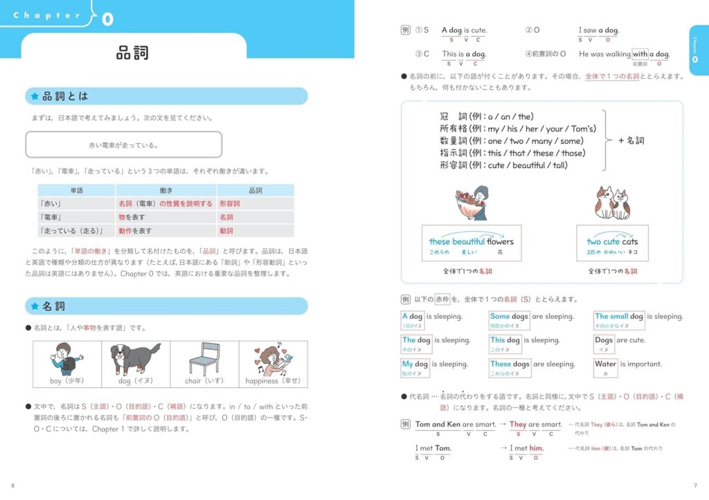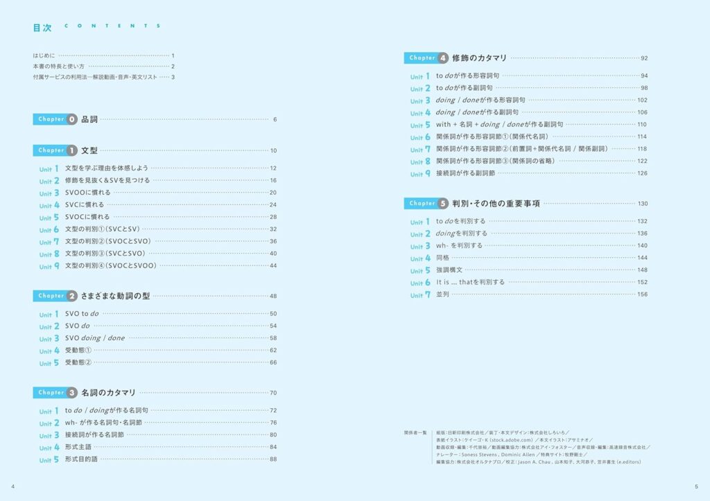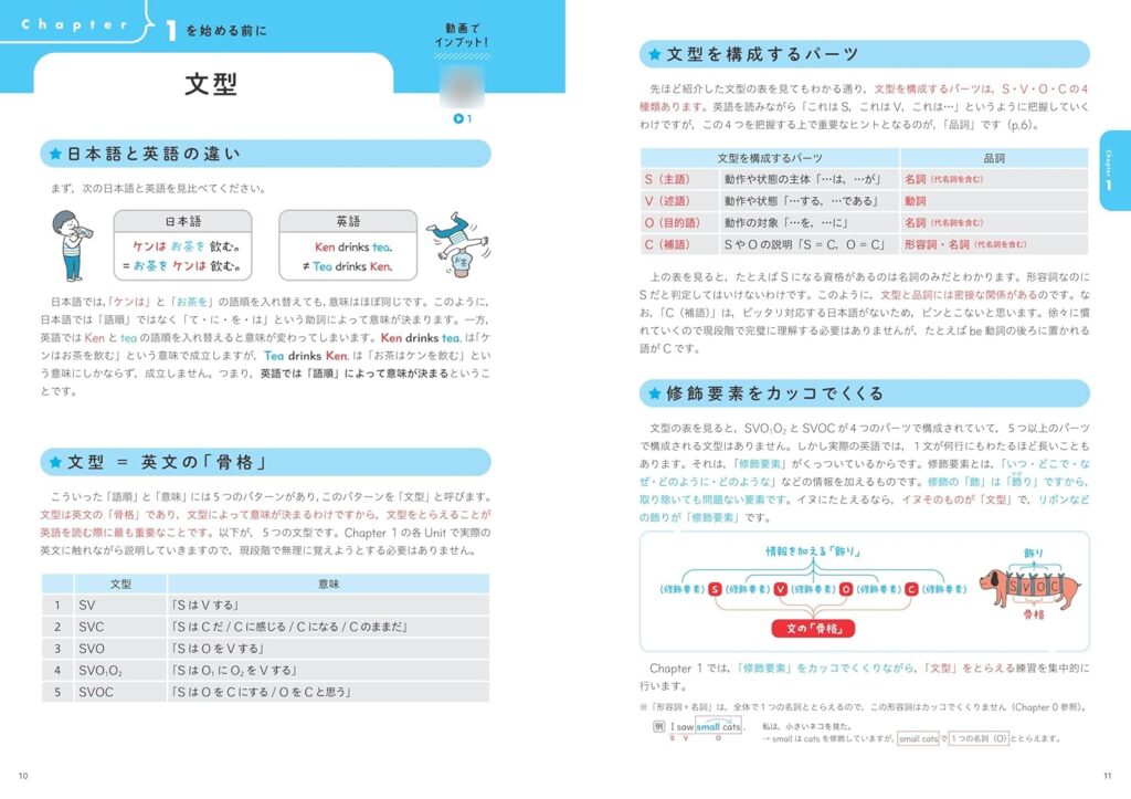 6章構成で、品詞→文の種類→動詞パターン→名詞句→修飾語句→識別・重要概念、と英文を読む上での「骨格」を体系的にステップアップ形式で積み上げる設計になっています。